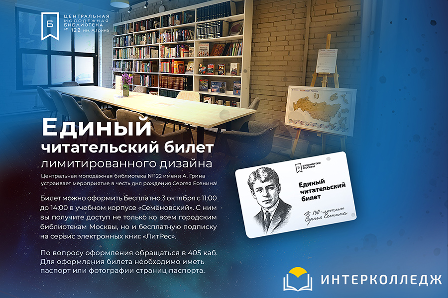 В честь дня рождения Сергея Есенина, 3 октября, не упустите возможность получить Единый читательский билет лимитированного дизайна от нашего партнёра в лице Центральной молодёжной библиотеки № 122 имени А. Грина. Билет можно оформить бесплатно с 11:00 до 14:00 в учебном корпусе «Семеновский». С ним вы получите доступ не только ко всем городским библиотекам Москвы, но и бесплатную подписку на сервис электронных книг «ЛитРес». Для оформления билета необходимо иметь паспорт или фотографии страниц паспорта.