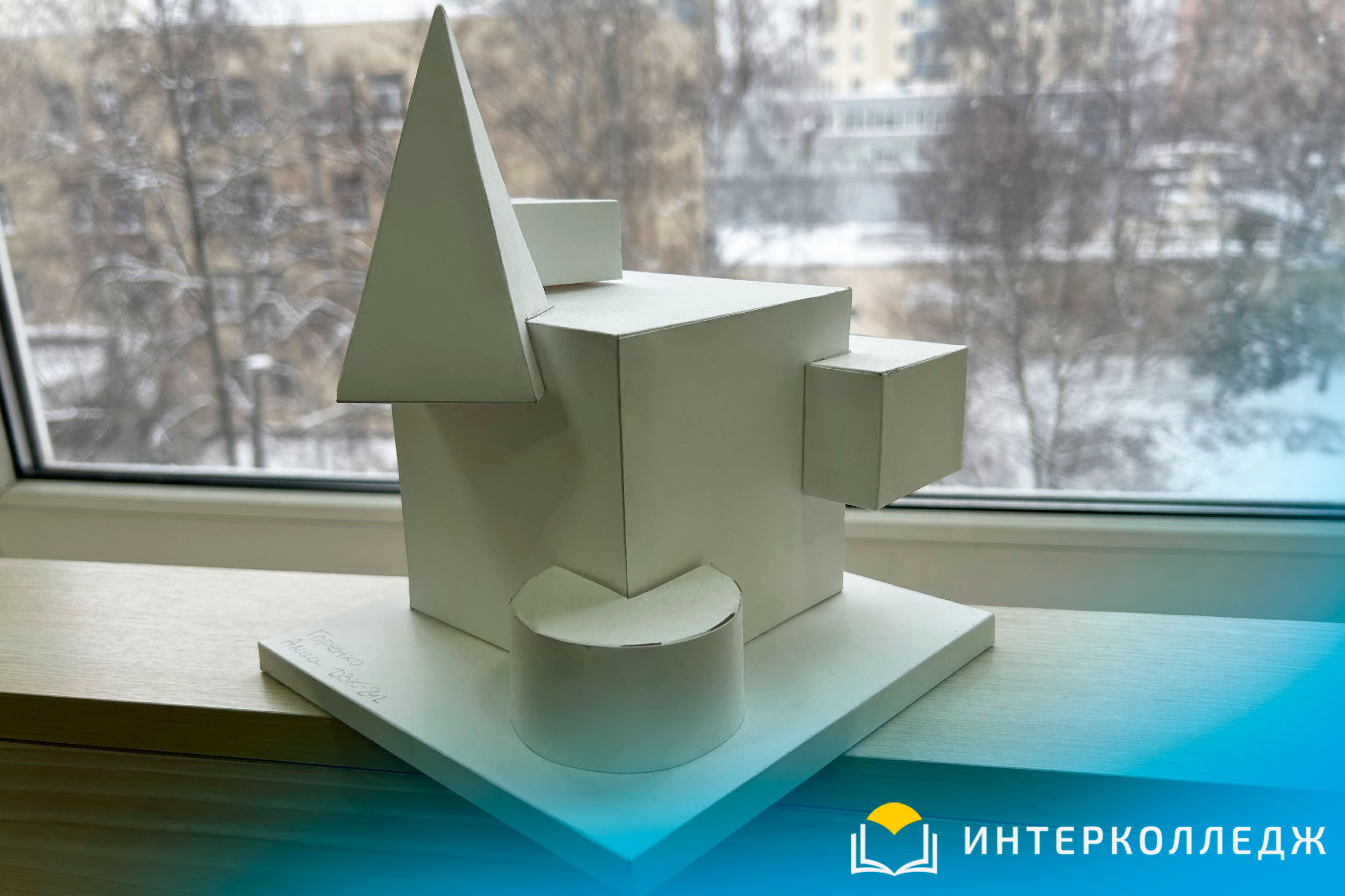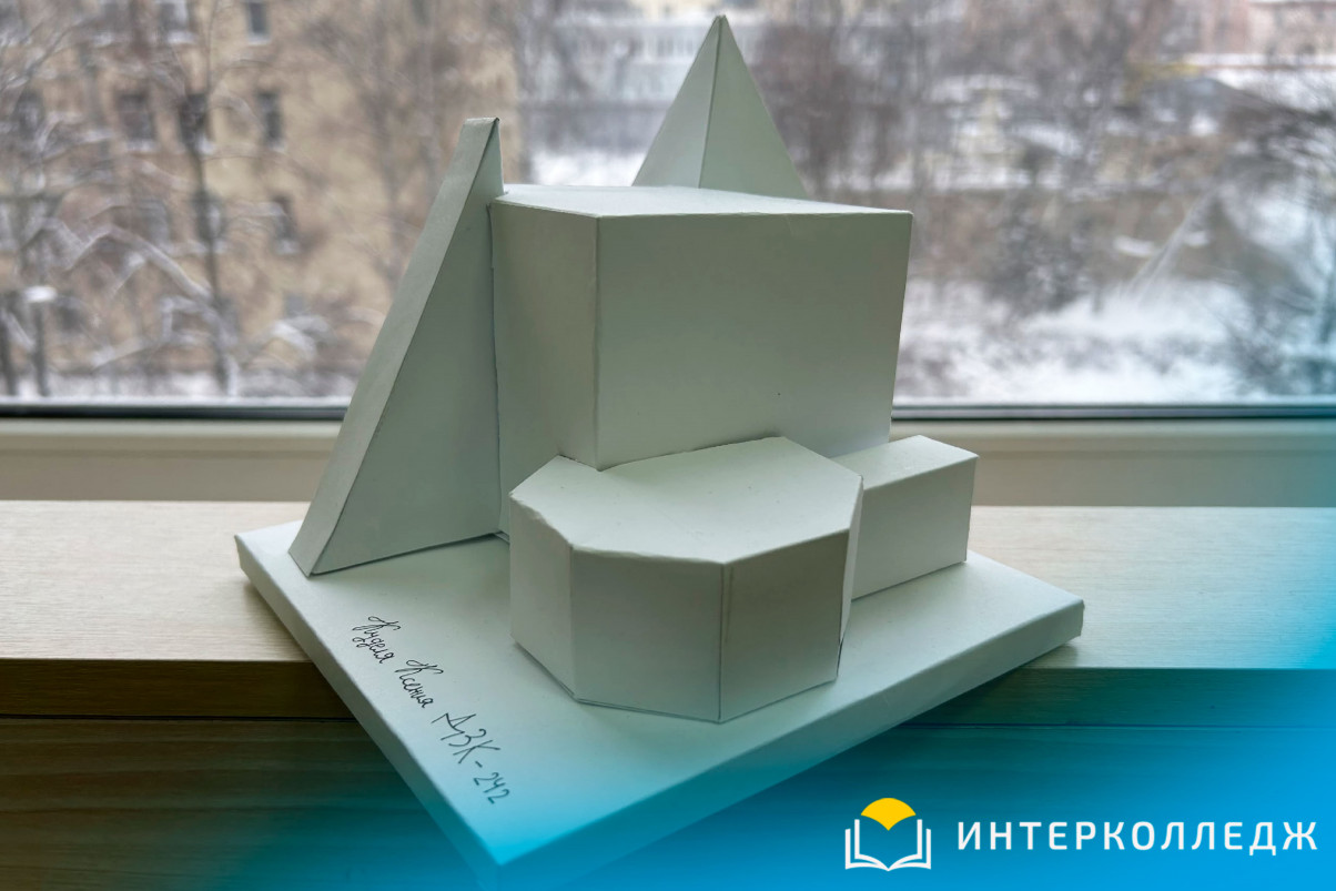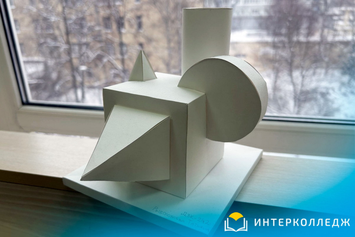 На практических занятиях обучающиеся получили и отработали ключевые навыки макетирования. Они освоили базовые технологические операции, включая разметку, биговку, создание развертки каждой фигуры, а также различные методы соединения деталей: от прорезей элементов до применения специализированных клеев. Студенты выполнили задание по созданию врезанных геометрических фигур и создали полноценные композиционные макеты, что позволило на практике изучить вопросы устойчивости, баланса и формообразования.