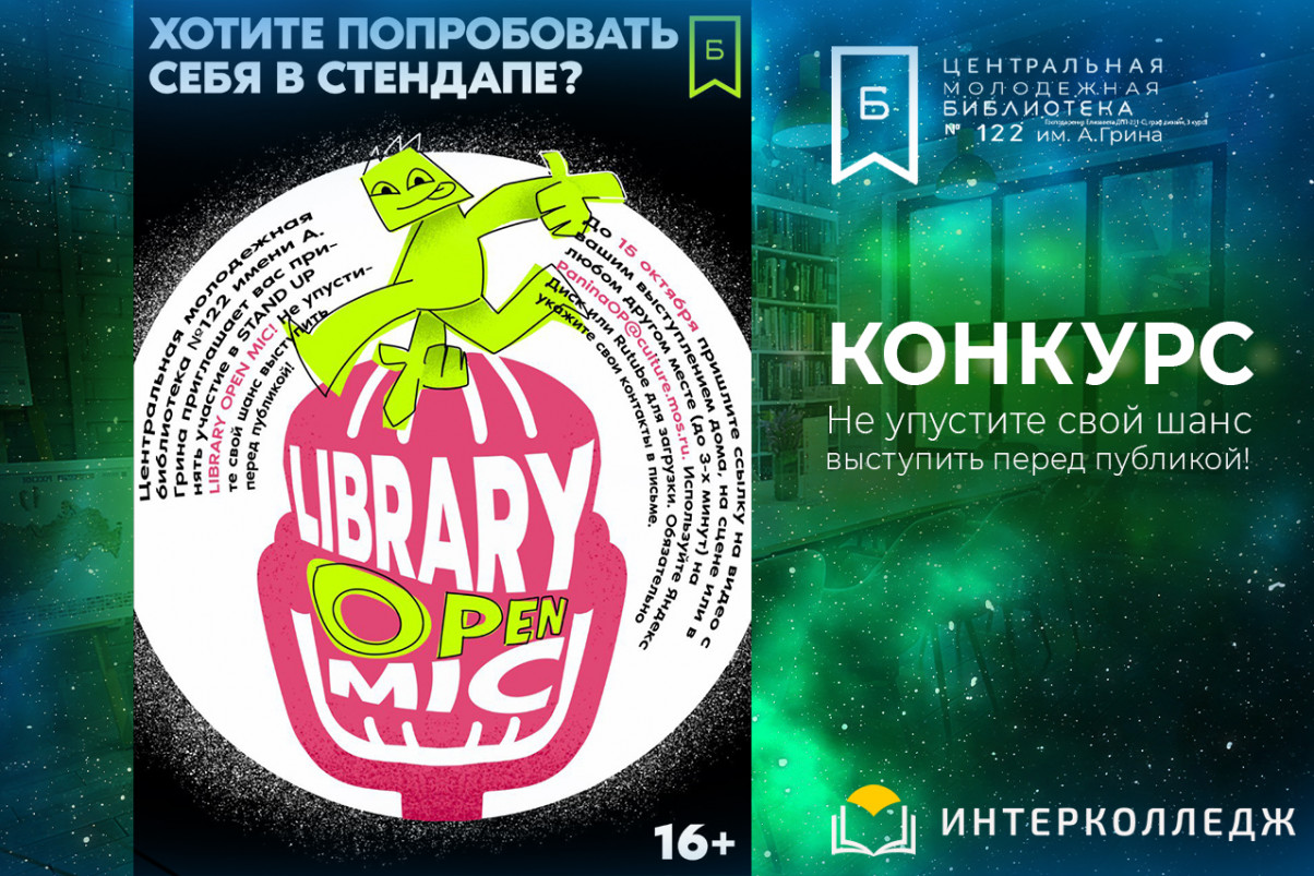 Хотите попробовать себя в стендапе? Центральная молодежная библиотека №122 имени А. Грина приглашает вас принять участие в STAND UP LIBRARY OPEN MIC! Не упустите свой шанс выступить перед публикой!