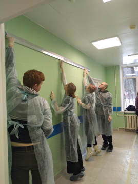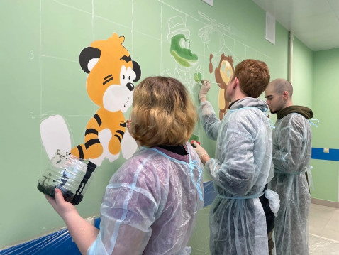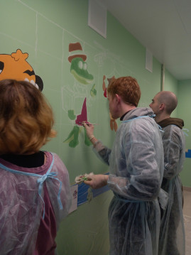 К нам обратились сотрудники Московской областной больницы из Пушкино с просьбой украсить стены в детском отделении амбулатории №2. На просьбу откликнулись студенты отделения дизайна «Интерколледжа» и кафедры дизайна Института экономики и культуры. В воскресный день, 12 марта, не ради оценок, а по зову сердца наши студенты украсили интерьер детского отделения известными и всеми любимыми персонажами советских мультфильмов. Художественное оформление детских заведений – очень ответственный и трудоемкый процесс. Впервые столкнувшись с таким вызовом, под руководством доцента кафедры Банка Ивана Николаевича и преподавателя дисциплин дизайна Семенихиной Валентины Александровны ребята с честью справились с задачей, а руководство больницы, медперсонал и пациенты отметили высокий художественный уровень и профессиональное выполнение работы, особенный восторг выразили юные посетители амбулатории. Кроме того, городское телевидение сняло репортаж с интервью участников проекта.