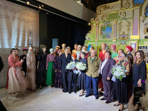 На ковровой дорожке в центре зала, в окружении роскошных костюмов, выставленных в качестве инсталляции, дает интервью Татьяна Михалкова: “Наш вечер стал уже доброй традицией. Это праздник весны, моды, дизайна и кино. Кино — это сложный процесс, в котором участвует большое количество людей, но художник по костюмам при этом всегда находится вне кадра, и сегодня мы решили «показать» его крупным планом”.