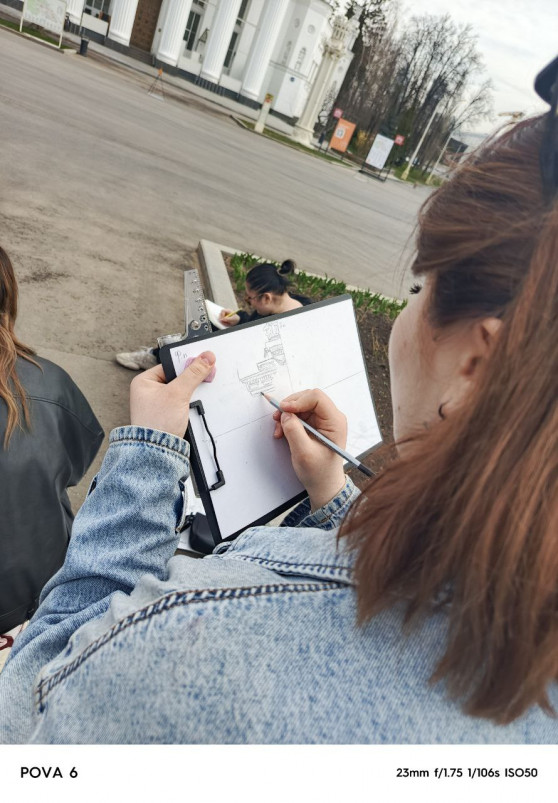 Солнечная погода, которая пришла ранней весной и принесла с собой небывалое тепло способствовала выезду на ВДНХ. Группа студентов-дизайнеров сосредоточенно склонилась над своими работами, строя ортогональные чертежи павильонов ВДНХ. Выездное занятие было необычным. Вместо привычной аудитории – величественное пространство, наполненное духом инженерной мысли и космических амбиций.