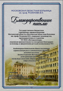 Главврач Московской областной больницы имени профессора Розанова в подмосковном городе Пушкино Мануйлов Владимир Михайлович вручил благодарственные письма, адресованные руководству, преподавателям и студентам «Интерколледжа» и Института экономики и культуры за помощь в оформлении детских медицинских учреждений Пушкинского городского округа. Владимир Михайлович от лица медработников поблагодарил наших ребят за их вдохновенный и добровольный труд, отметил высокий творческий уровень работ наших студентов, передал восторженные отзывы юных пациентов и их родителей. С ответным словом выступил директор «Интерколледжа» Тимур Юрьевич Ивлиев. Он рассказал пушкинцам о том, с каким энтузиазмом наши студенты отозвались на просьбу украсить стены детских поликлиник, как ответственно подошли к своей работе и о том, как наши преподаватели Банк Иван Николаевич и Семенихина Валентина Александровна смогли организовать творческий процесс. Тимур Юрьевич также отметил важность волонтерской работы наших студентов, отметив то, что такой труд приносит пользу не только практического характера, но и помогает развить морально-нравственные качества будущих дизайнеров.