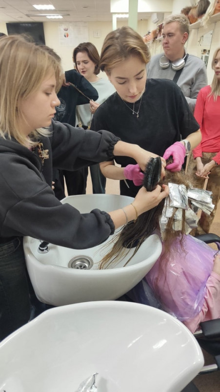 Выпускница отделения парикмахерского искусства 2020 года, а сегодня высококвалифицированный специалист Анастасия Романенко провела мастер-класс по технике окрашивания AirTouch и «Шатуш». Перенимали опыт учащиеся групп «Интерколледжа»: ТПИ-211, ТПИ-213, ТПИ-222, ТПИ-221, ПИК-233.
