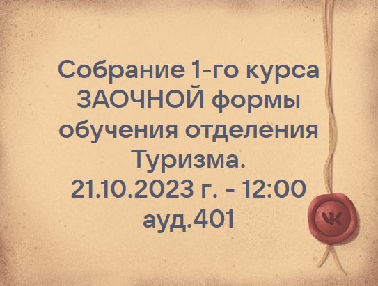 Собрание 1-го курса ЗАОЧНОЙ формы обучения отделения Туризма. 21.10.2023 г. - 12:00 ауд.401