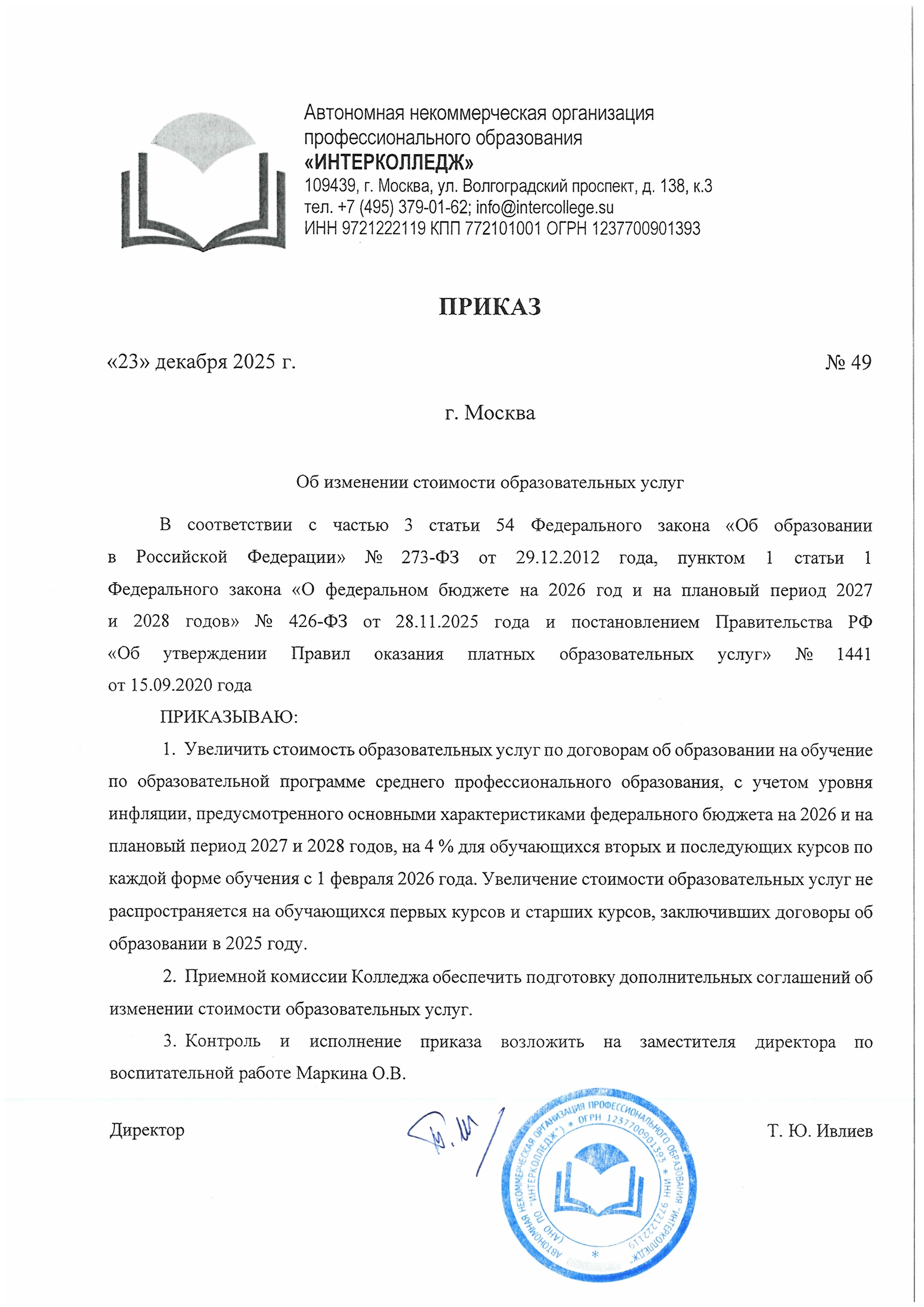 23 декабря 2025 года Директором подписан Приказ "Об изменении стоимости образовательных услуг" устанавливающий стоимость обучения со 2-го семестра 2025/2026 учебного года для всех действующих студентов, за исключением заключивших договор на обучение в 2025 году.