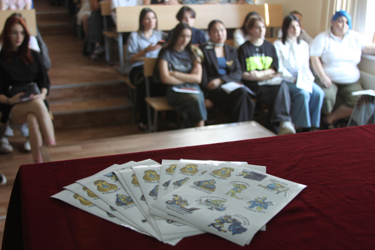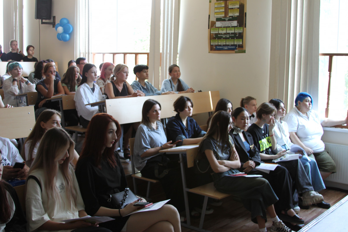 Перед первокурсниками выступили студенты-наставники старших курсов: Валерия Будей, Гульбича Алиева, Айхан Бекбергенова, Софья Гунина, которые рассказали о своей учебе в колледже и предложили свою помощь в адаптации к учебному процессу